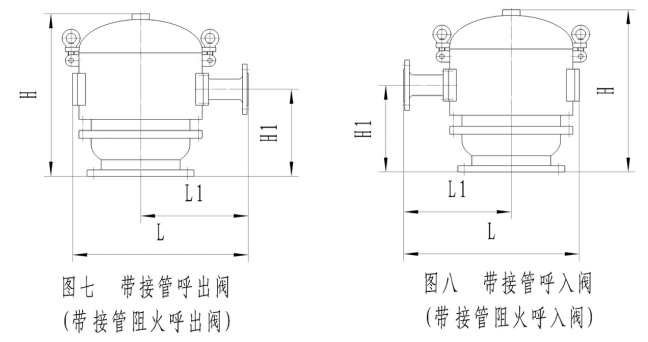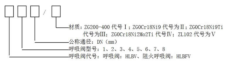 標(biāo)記示例:公稱通徑DN100、主體材料ZL102帶吸入接管阻火呼吸閥標(biāo)注:HLBFV2-100/Ⅴ。