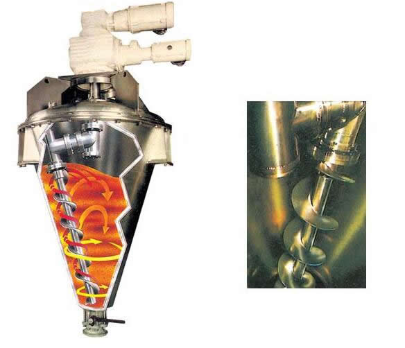2、該機(jī)適用于固(粉)~固(粉)(粉體粒度20—400目/英寸)混合及固(粉)~液(含液量<15%)的混合。特殊的錐體帶夾套裝置,可對(duì)物料進(jìn)行加熱、干燥、冷卻。
